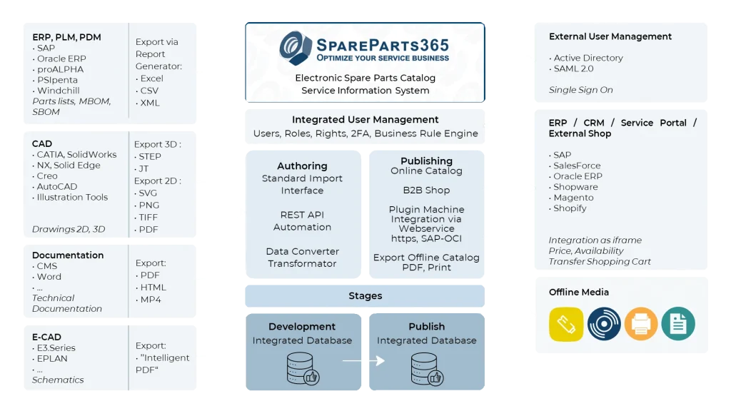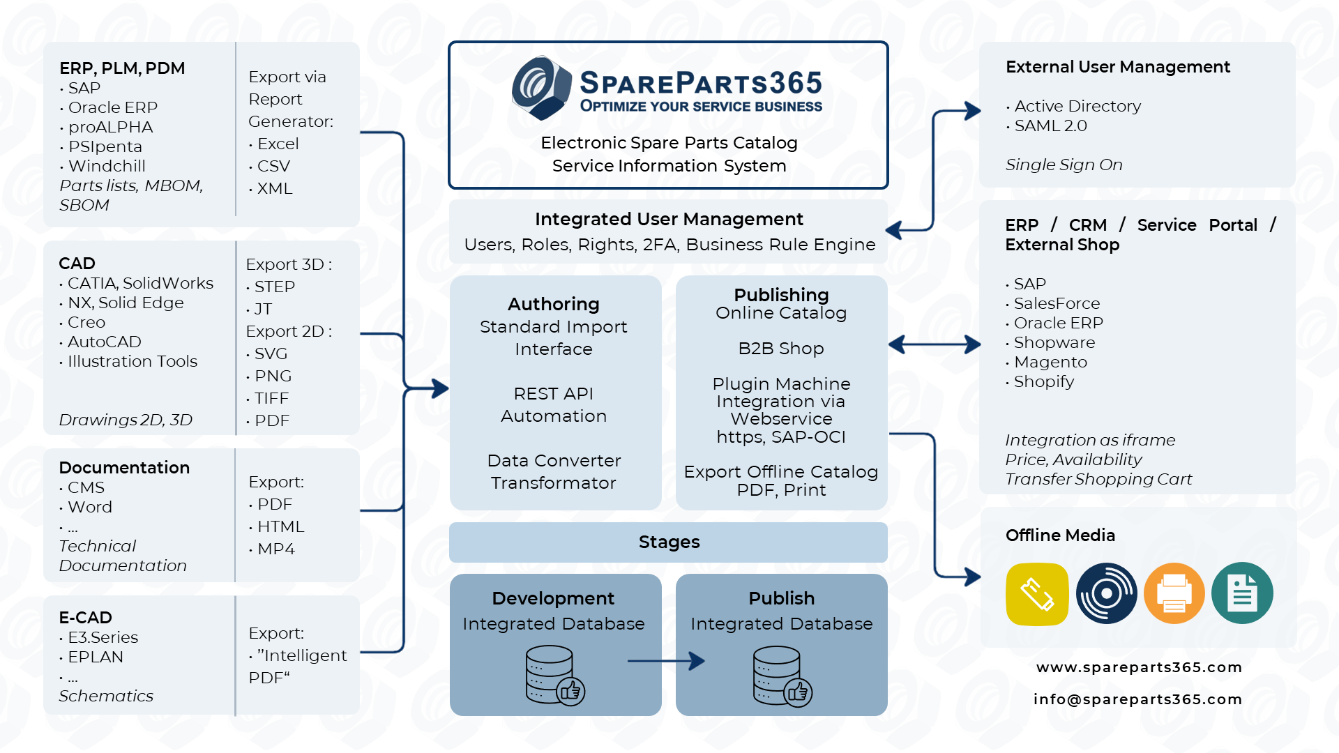 SpareParts365 integriert CAD-Formate von CATIA, SolidWorks, NX, Solid Edge, Creo und AutoCAD, für 2D- und 3D-Illustrationen.