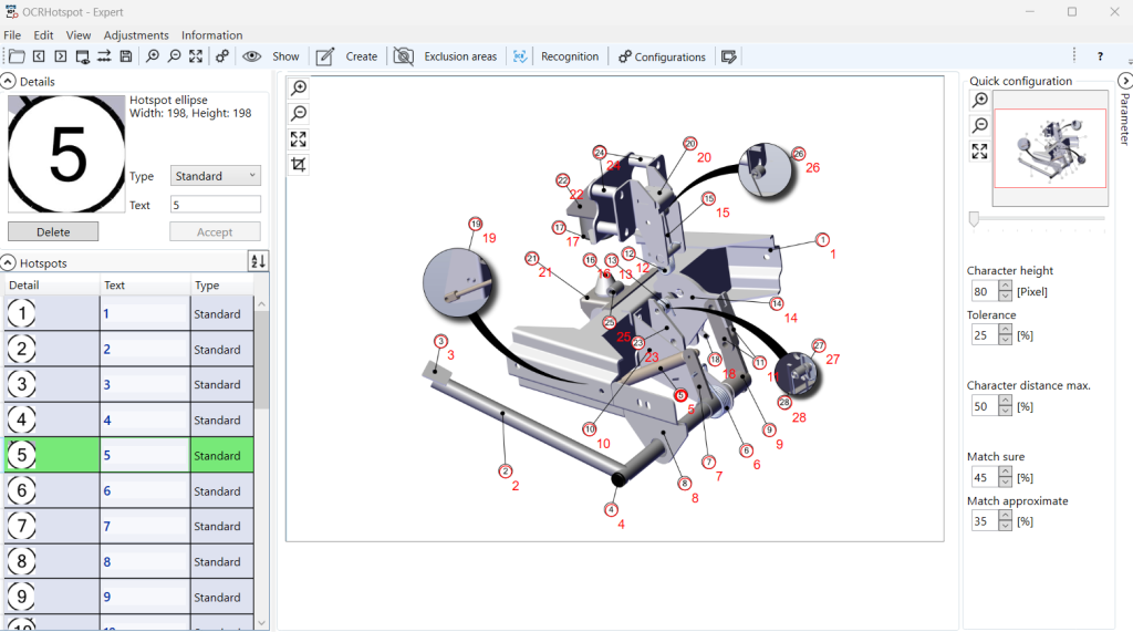 Das System erkennt automatisch die Verknüpfungen zwischen Zeichnungen und Stücklisten, wodurch Nutzer relevante Informationen schnell und effizient finden können. Falls die automatische Ermittlung nicht auf Anhieb perfekt funktioniert: Die Hotspot-Erkennung kann mit Ihren Daten trainiert werden.